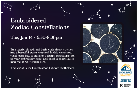 Turn fabric, thread, and basic embroidery stitches into a beautiful starry creation! In this workshop, you'll learn how to transfer a design onto fabric, set up your embroidery hoop, and stitch a constellation inspired by your zodiac sign.
